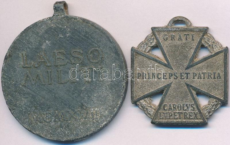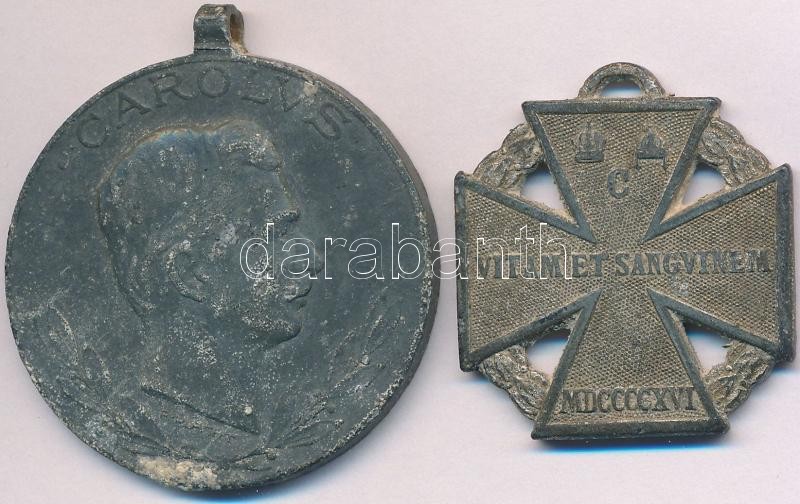 1916. "Károly-csapatkereszt" Zn kitüntetés, mellszalag és függesztőkarika nélkül + 1918. "Sebesültek Érme" Zn kitüntetés mellszalag és függesztőkarika nélkül. Szign.: R. Placht T:2- oxidáció