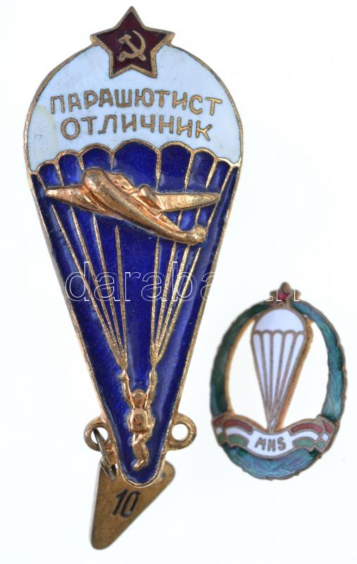 Beschreibung: ~1970-1980. "MHS (Munkára, harcra kész)" zománcozott fém ejtőernyős jelvény + Szovjetunió DN "Kiváló ejtőernyős" "10"-es, félig leszakadt bilétával, zománcozott fém jelvény T:2