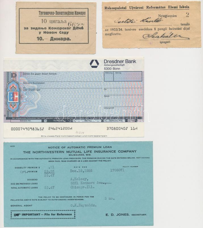 3db-os vegyes utazási csekk és csekk tétel, közte DN "Dresdner Bank" kitöltetlen csekkje + 3db számla és elismervény, közte 1933. "Rákospalotai Újvárosi Református Elemi Iskola" elismervénye az 1P-s beiratkozási díjról T:II,II-