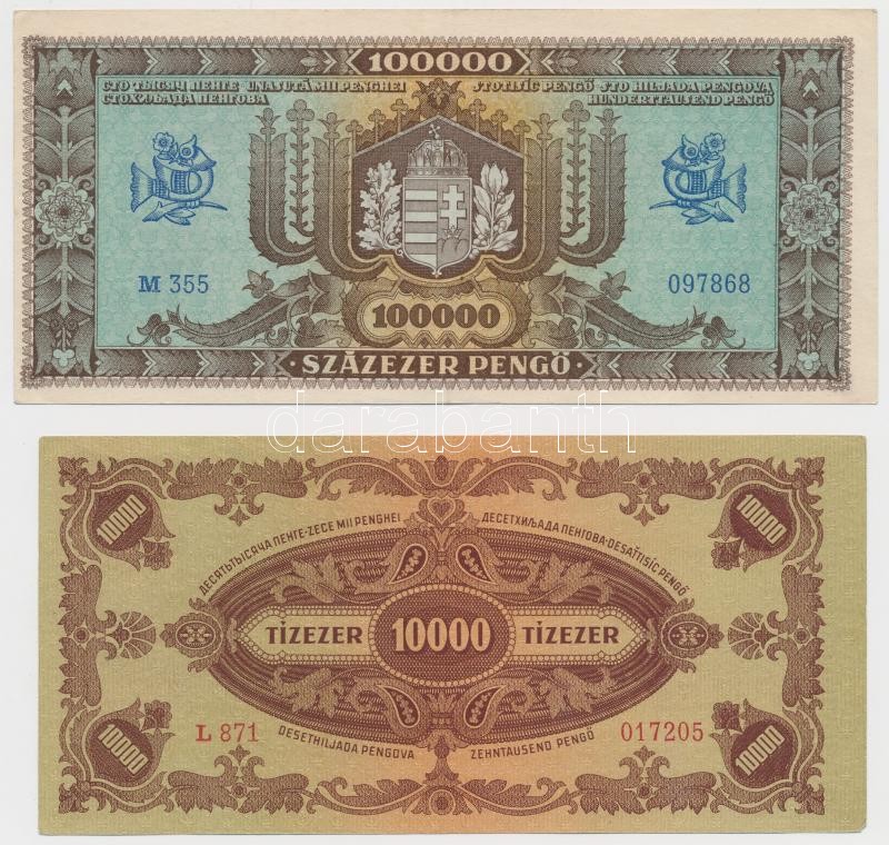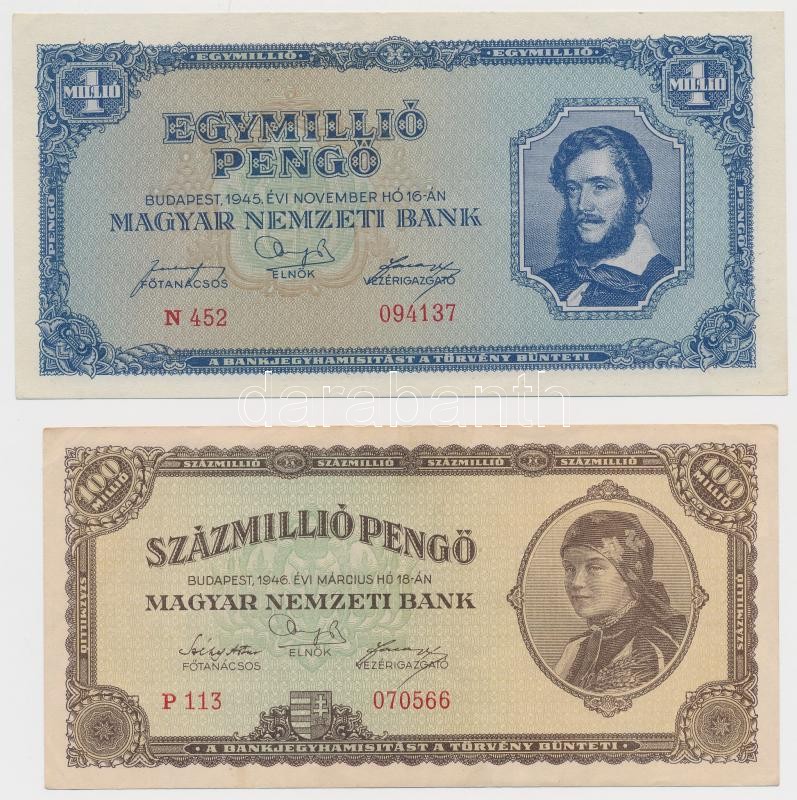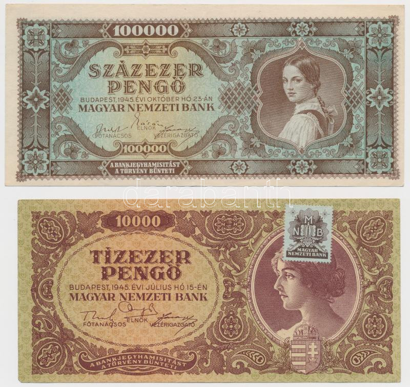 1945. 10.000P "MNB" bélyeggel + 1945. 100.000P + 1945. 1.000... https://www.darabanth.com/de/271-Fernauktion/271.0/Numismatik/Ungarische-Banknoten~300007/1945-10000P-MNB-belyeggel-plus-1945-100000P-plus-1945-1000000P-plus-1946-100000000P-TI-II--Ada~II1369939