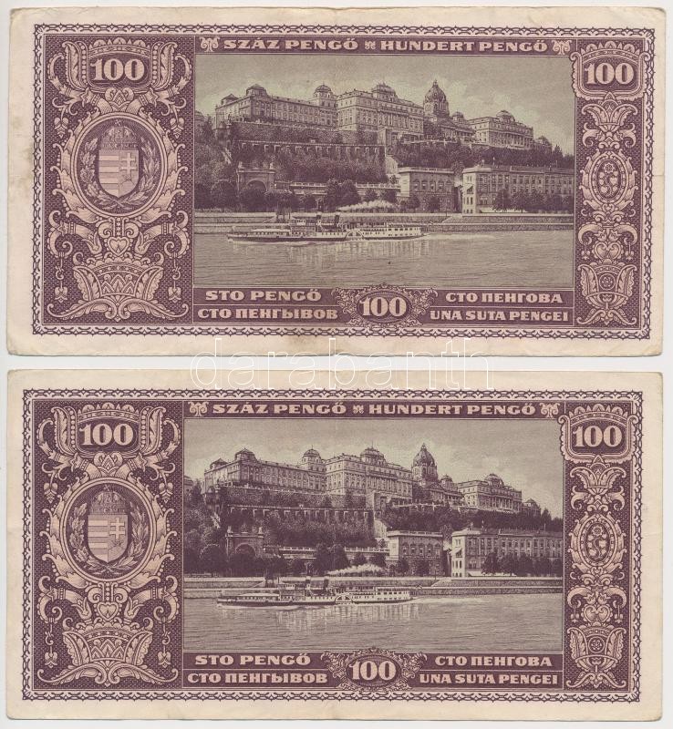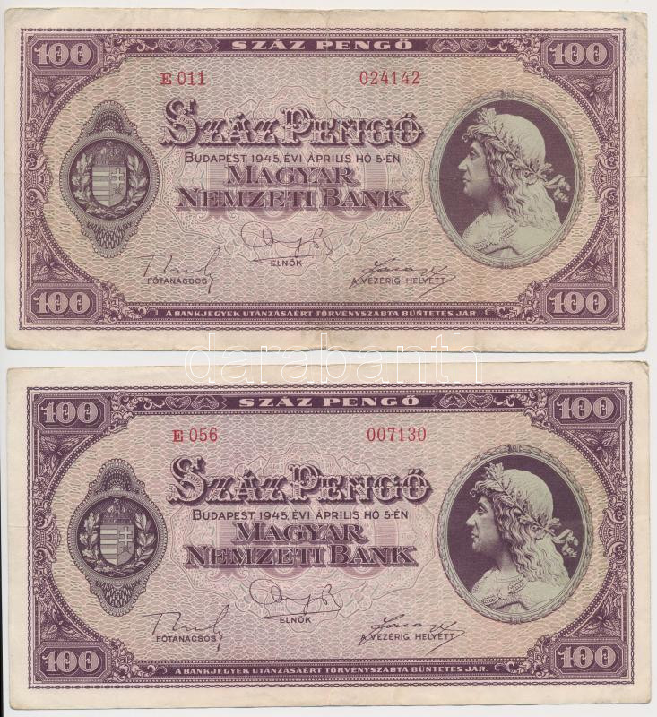 Beschreibung: 1945. 100P (2x) a Diósgyőri Papírgyár makkos-vízjelével, "E056" és "E011" sorozatszámokkal T:III