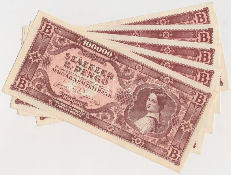 1946. 100.000BP (5x) T:I,I- https://www.darabanth.com/de/271-Fernauktion/271.0/Numismatik/Ungarische-Banknoten~300007/1946-100000BP-5x-TI-I-~II1379269