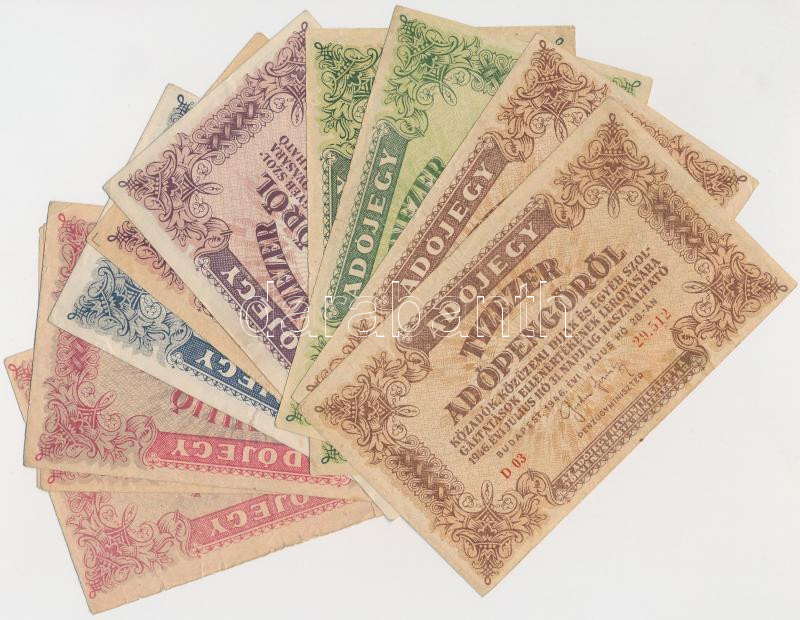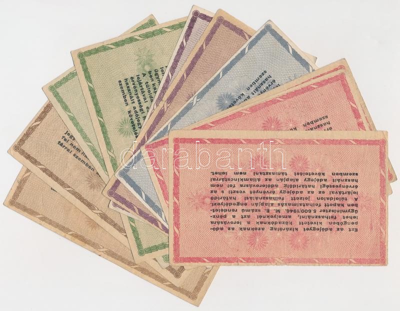 1946. 11db-os vegyes magyar adópengő bankjegy tétel, közte fordított c... https://www.darabanth.com/de/271-Fernauktion/271.0/Numismatik/Ungarische-Banknoten~300007/1946-11db-os-vegyes-magyar-adopengo-bankjegy-tetel-kozte-forditott-cimeres-sorozat-es-sor~II1372918