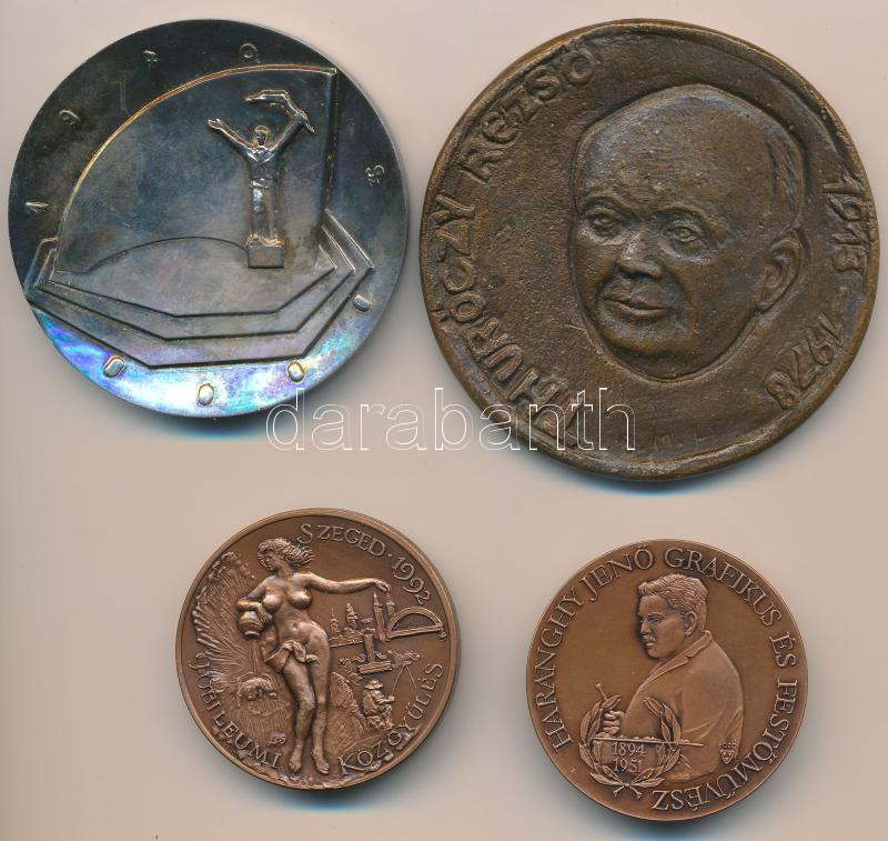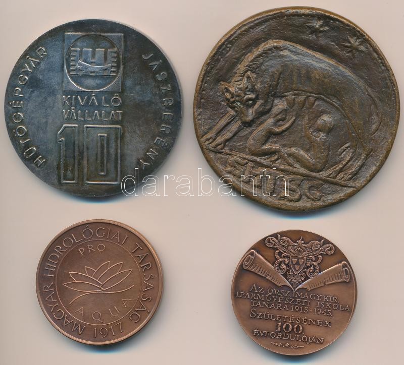 Beschreibung: Bozó Gyula (1913-2004) 1994. "Haranghy Jenő születésének 100. évfordulójára" Br emlékérem (42,5mm) + 1992. "Magyar Hidrológiai Társaság 1917. Pro Aqua / Jubileumi Közgyűlés - Szeged" Br emlékérem (42,5mm) + 1978. "SMTSG / Thuróczy Rezső 1913-1978" kétoldalas Br emlékplakett (70mm) + 1970. Kiváló Vállalat - Jászberény Hűtőgépgyár" ezüstözött fém emlékérem (60mm)