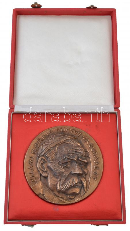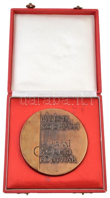 DN "Állami Gorkij Könyvtár Budapest / Hűséges Szolgálatért - Állami Gorkij Könyvtár" öntött Br plakett, gravirozott eredeti tokban (115mm) T:2