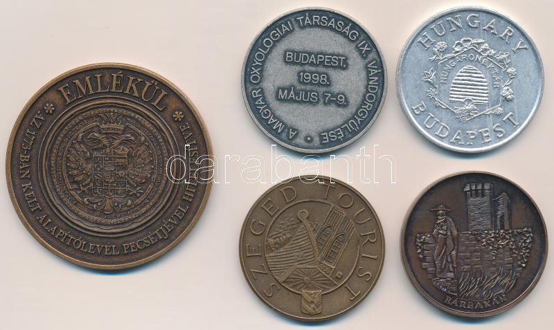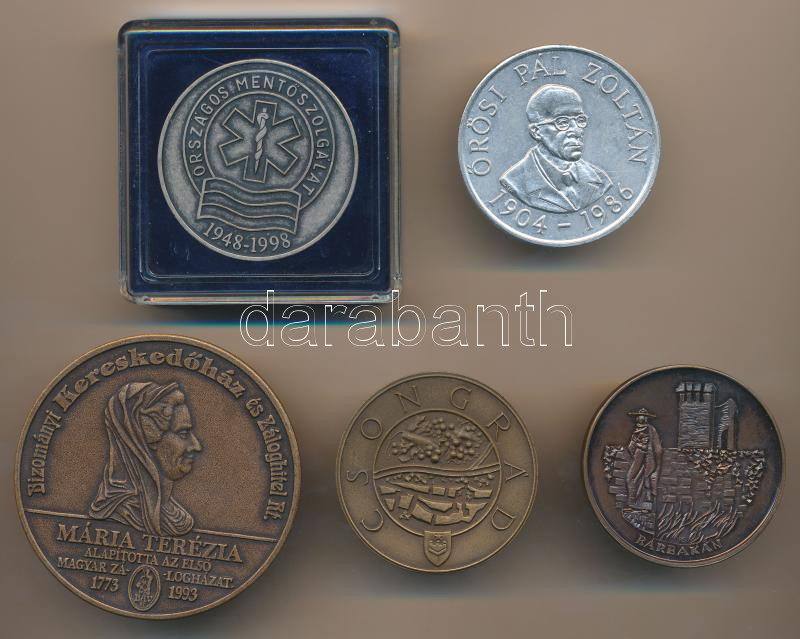 Vegyes 5db-os emlékérem tétel, közte 1986. "Őrösi Pál Zoltán 1904-1986" Al emlékérem, 1993. "Bizományi Kereskedőház és Záloghitel Rt. - Mária Terézia alapította az első magyar zálogházat 1773 - 1993. / Emlékül - Az 1773-ban kelt alapítólevél pecsétjével hitelesítve" Br emlékérem (60mm) T:2