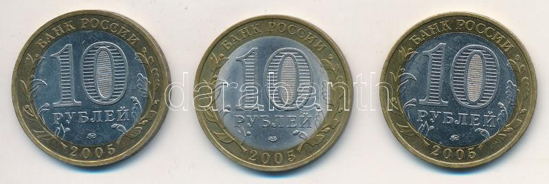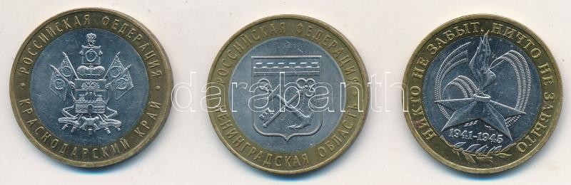 Oroszország 2005. 10R "A nagy győzelem 60. évfordulója" + 2005. 10R "Leningrádi terület" + 2005. 10R "Krasznodrai határterület" T:2 k., ph. Russia 2005. 10R "Great Victory, 60th Anniversary" + 2005. 10 Roubles "Leningrad Oblast" + 2005. 10 Roubles "Krasnodar Krai" C:XF scratch, edge error Krause Y#827, Y#887, Y#889