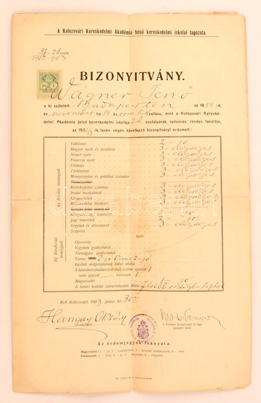 Beschreibung: 1903 a Kolozsvári Kereskedelmi Akadémia felső kereskedelmi iskolai tagozatának bizonyítványa, okmánybélyeggel