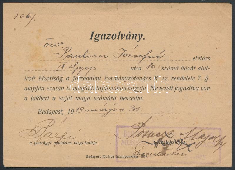 Beschreibung: 1919. május Bp., Pénzügyi népbiztosi igazolás ház magántulajdonban való meghagyásáról