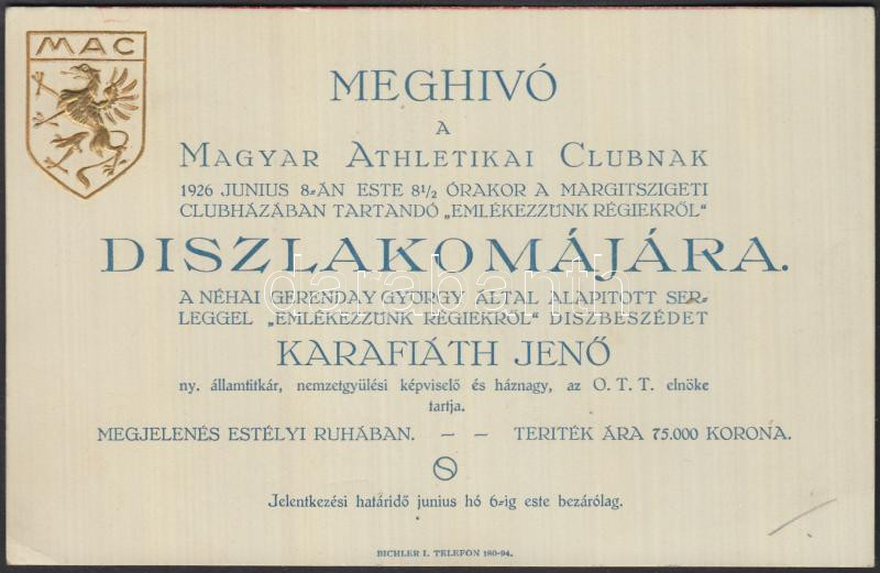 1926 Bp. Margitsziget, Meghívó a Magyar Athletikai Club díszlakomájára https://www.darabanth.com/de/272-Fernauktion/272.0/Andere-Sammelgebiete/Drucksachen~47/1926-Bp-Margitsziget-Meghivo-a-Magyar-Athletikai-Club-diszlakomajara~II1387378