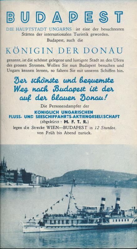 Beschreibung: 1939 Wien-Budapest mit ungarischen MFTR Dampfern, dunai gőzhajó, kihajthatós Klösz nyomtatvány, 20x47cm