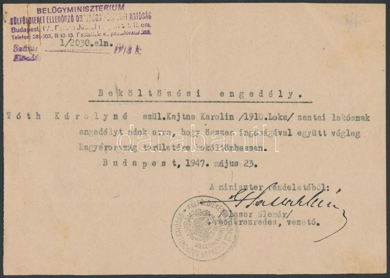 Beschreibung: 1947 Bp., Zentai lakos számára kiállított beköltözési engedély