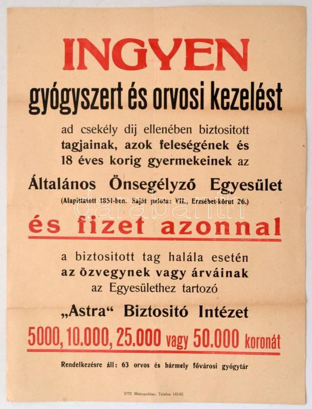 Beschreibung: cca 1920-1927 Az Általános Önsegélyező Egyesület gyógyszert és orvosi kezelést hirdető kisplakátja, hajtott, 33x24 cm