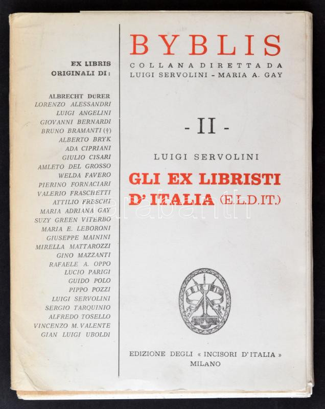Luigi Servolini: Gli ex libristi D'Italia (E.L.D.IT.), Byblis II. 28db ex libris, metszetek, egy részük jelzett, eredeti tokban,18x14cm / Luigi Servolini: Gli ex libristi D'Italia (E.L.D.IT.), Byblis II. catalogues, on the topic of bookplates