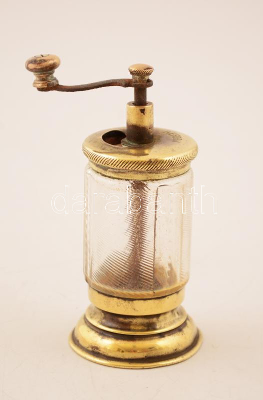 Beschreibung: "Reform" feliratú réz-üveg kisméretű borsdaráló, m: 11 cm