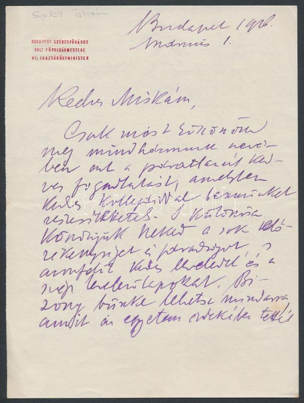 1926 Bp., Sipőcz István nyugalmazott igazságügy-miniszter, volt székesfővárosi polgármester kétoldalas autográf levele Pekár Mihályhoz