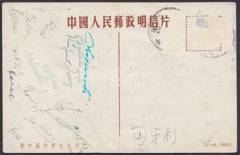 Beschreibung: 1964 a KÃnába delegált magyar "C" futballválogatott és néhány kereten kÃvüli játékos aláÃrása (Tullner, Babolcsay, Várnai, Irtási, Kónya, stb.) KÃnából küldött levelezÅ‘lapon
