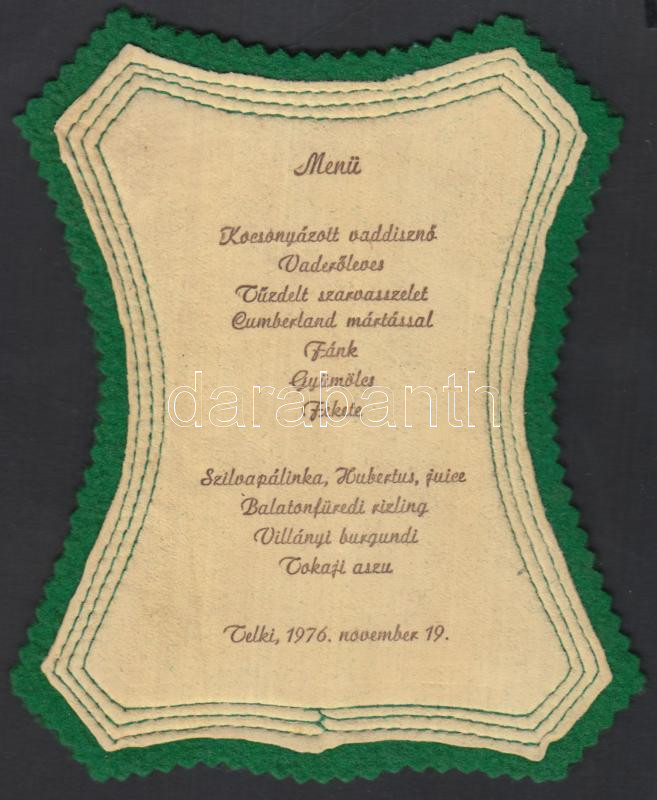 1976 Mindenféle finom falatot kínáló nemez-bőr menükártya, Telki 1976.... https://www.darabanth.com/de/272-Fernauktion/272.0/Andere-Sammelgebiete/~25/1976-Mindenfele-finom-falatot-kinalo-nemez-bor-menukartya-Telki-1976-november-19-feliratta~II1387393