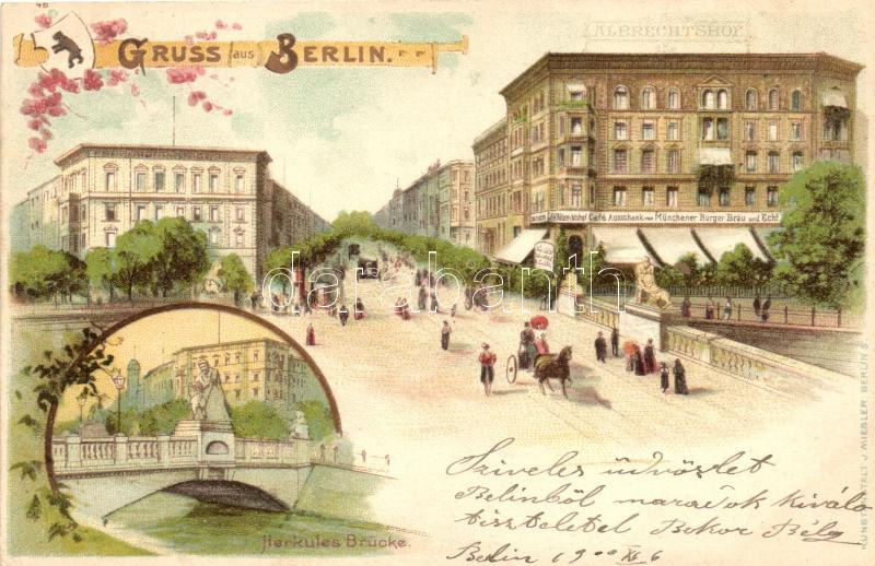 Beschreibung: Berlin, Herkules Brücke, Albrechtshof, Cafe Ausschank von Münchener Burger-Bräu und Echt / bridge, cafe, Kunstanstalt J. Miesler floral, litho