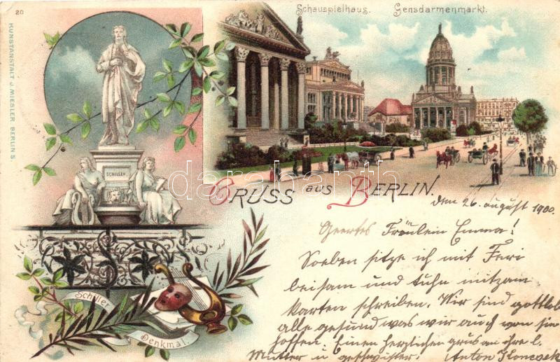 Beschreibung: Berlin, Schauspielhaus, Gendarmenmarkt, Schiller Denkmal / theatre, square, statue, Kunstanstalt J. Miesler 20. floral, litho (EK)