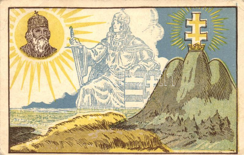Szent István, Hungária nőalak / Hungarian irredenta postcard (EB) https://www.darabanth.com/de/272-Fernauktion/272.0/Ansichtskarten/Irredenta~200063/Szent-Istvan-Hungaria-noalak-Hungarian-irredenta-postcard-EB~II1386189
