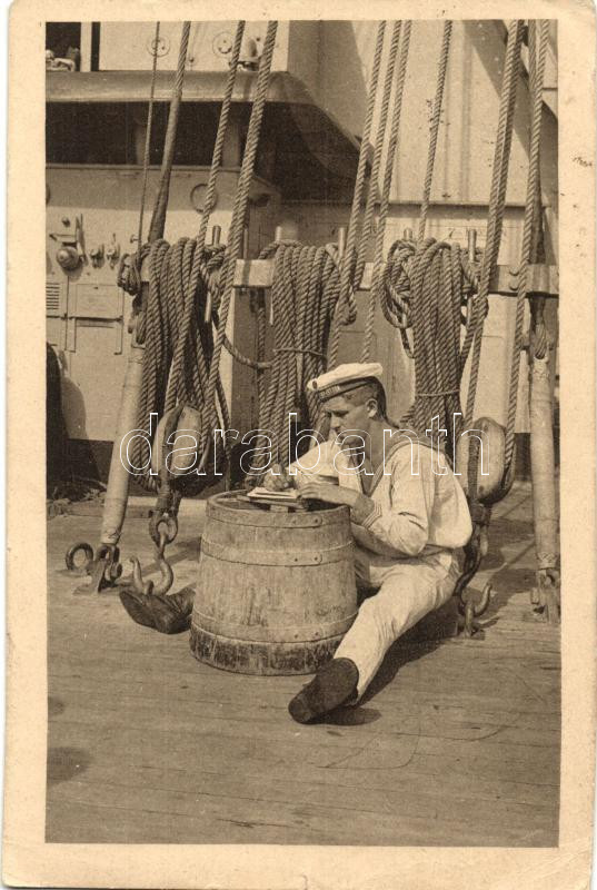 'Brief nach Hause' / levelet író matróz az SMS Szent István csatahajó fedélzetén / K. u. K. Kriegsmarine battleship, mariner on board, Phot. A. Hauger, Pola (kis szakadás / small tear)