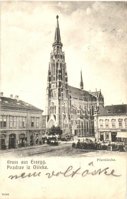 Beschreibung: Eszék, Osiek; Pfarrkirche, Kavana Korso / church, cafe (EK)