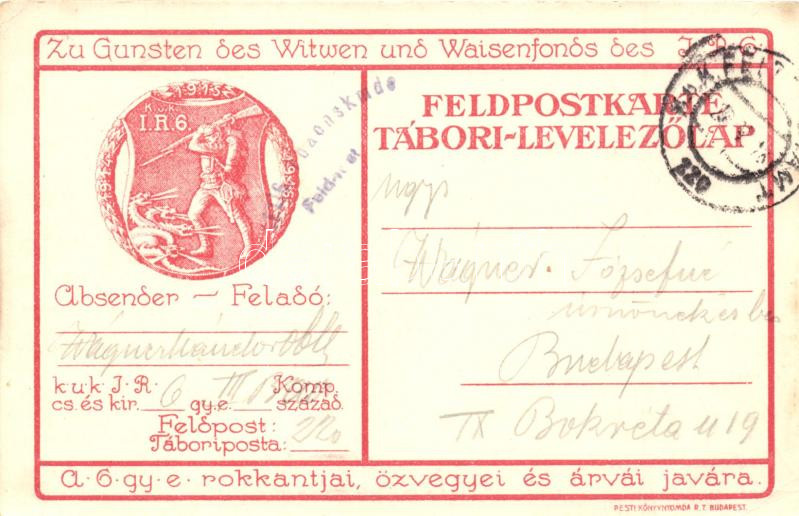 Cs. és Kir. 6. gyalogezred rokkantjai, özvegyei és árvái javára / 1915... https://www.darabanth.com/de/272-Fernauktion/272.0/Ansichtskarten/Militaria~200066/Cs-es-Kir-6-gyalogezred-rokkantjai-ozvegyei-es-arvai-javara-1915-KuK-Infantry-Regimen~II1387880