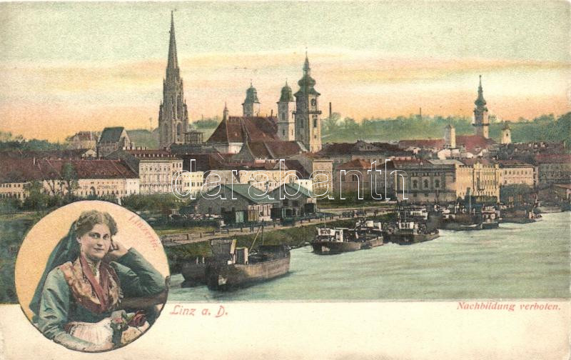 Beschreibung: Linz an der Donau, Linzerin, commercial port, folklore
