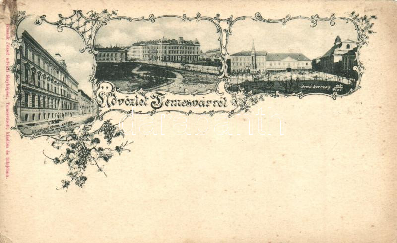 1899 Temesvár, Timisoara; Belvárosi elemi iskola, Józsefváros, Küttl és Jenő herceg tér, kiadja Kossak József udvari fényképész / school, squares, floral (Rb)