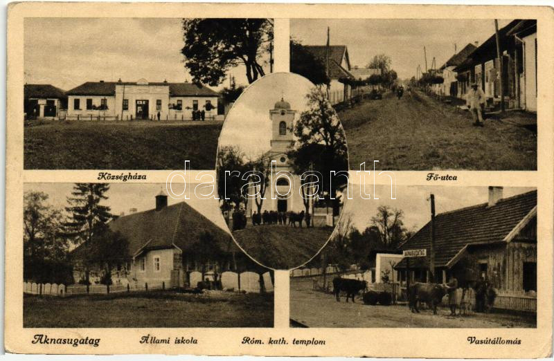 Aknasugatag, Ocna Sugatag; Vasútállomás, római katolikus templom, községháza, állami iskola, Fő utca / railway station, church, town hall, school, street (ragasztónyom / gluemark)