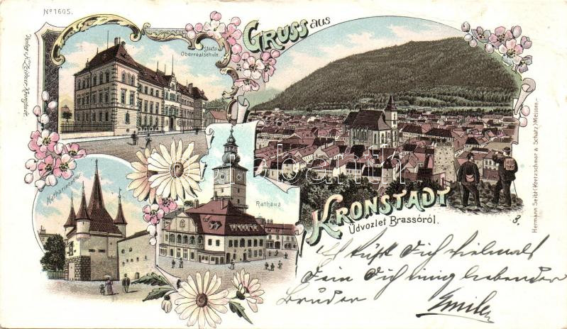 Brassó, Kronstadt, Brasov; Városháza, felső reáliskola, Katalin kapu, látkép, H. Zeidner kiadása / town hall, school, gate, general view, floral, litho (EB)