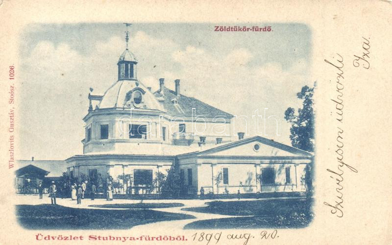 Beschreibung: 1899 Stubnyafürdő, Turcianske Teplice; Zöldtükör fürdő, kiadja Wlasulovits Gusztáv