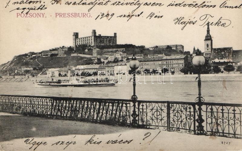 Pozsony, Látkép a várral / castle view, steamship (fl) https://www.darabanth.com/de/272-Fernauktion/272.0/Ansichtskarten/Slowakei~400315/Pozsony-Latkep-a-varral-castle-view-steamship-fl~II1349348