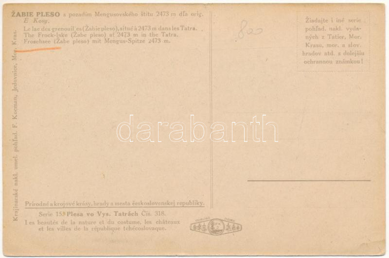 Tátra, Menguszfalvi Kis-Békás-tó / lake (kis szakadás / small tear) https://www.darabanth.com/de/272-Fernauktion/272.0/Ansichtskarten/Slowakei~400315/Tatra-Menguszfalvi-Kis-Bekas-to-lake-kis-szakadas-small-tear~II1367599
