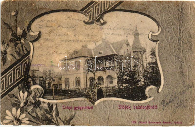 Siófok-Balatonfürdő, Telepi gyógyintézet, Schwarcz Bernát floral (fa) https://www.darabanth.com/de/272-Fernauktion/272.0/Ansichtskarten/Ungarn~200075/Siofok-Balatonfurdo-Telepi-gyogyintezet-Schwarcz-Bernat-floral-fa~II1381028