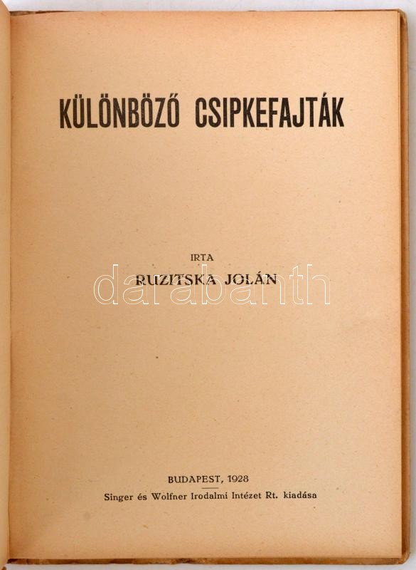 Ruzitska Jolán: Különböző Csipkefajták. Kis Könyvek. Budapest, 1928, Singer és Wolfner Irodalmi Intézet Rt., 54 p. Fekete-fehér illusztrációkkal. Kiadói papír kötés. Jó állapotban.