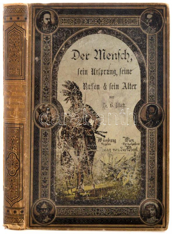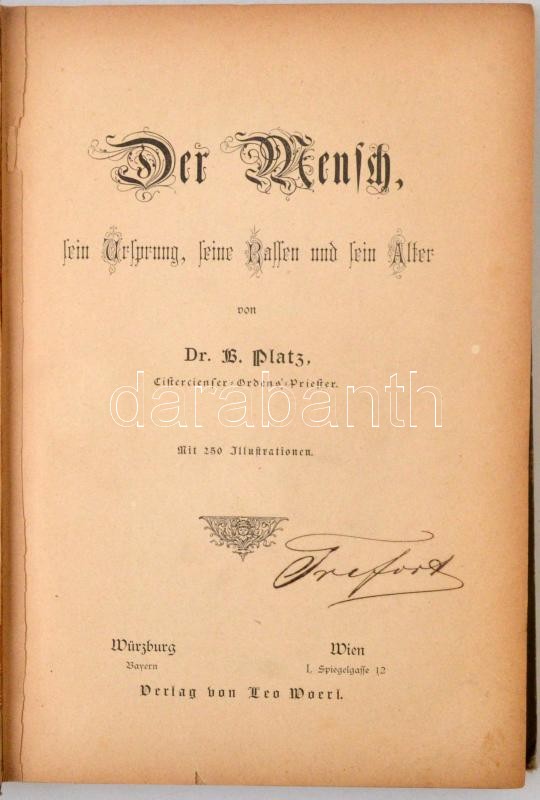 Dr. B. Platz: Der Mensch, sein Ursprung, seine Rassen und sein Alter. Würzburg, Wien, Verlag von Leo Woerl. Benne Trefort Ágoston ALÁÍRÁSÁVAL! Kiadói egészvászon kötés, festett lapszélek, gerincnél sérült, kopottas állapotban.