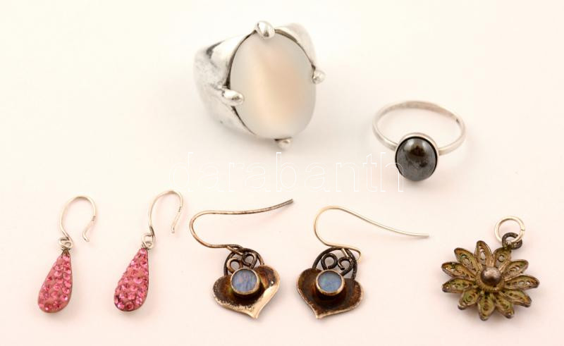 Beschreibung: Ezüst (Ag.) tétel: gyűrű ( 2db), medál, fülbevaló (2 db), összesen: 5 db, bruttó:38 g