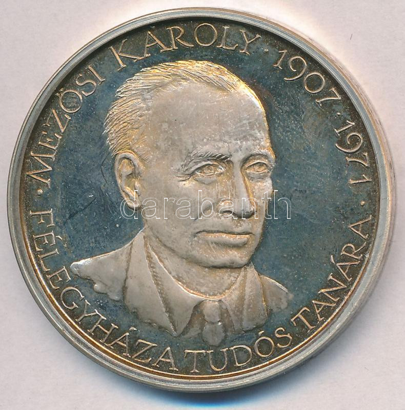 Lapis András (1942- ) 1971. "Mezősi Károly 1907-1971 - Félegyháza tudós tanára / Közművelődési Egyesület - Kiskunfélegyháza" jelzett ezüst emlékérem, eredeti tokban (36,00g/0.925/43mm) T:PP ujjlenyomat, patina