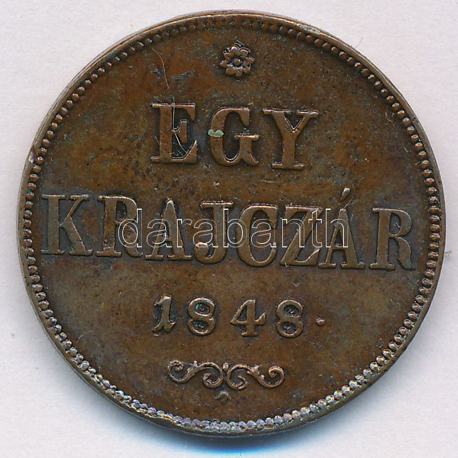 1848. 1kr Cu T:2 kis ph. Adamo B1 https://www.darabanth.com/de/272-Fernauktion/272.0/Numismatik/Ungarische-Munzen-und-Munzen-mit-ungarischem-Munzzeichen~300008/1848-1kr-Cu-T2-kis-ph-Adamo-B1~II1385338