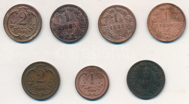 1859A 1kr Cu + 1885. 1kr Cu (2x) + 1914. 1h Br + 1912-1914. 2h Br (2x) T:2-3-, karc, ph., egyiken hajlott lemez 1859A 1 Kreuzer Cu + 1885. 1 Kreuzer Cu (2x) + 1914. 1 Heller Br + 1912-1914. 2 Heller Br (2x) C:XF-VG, scratch, edge error, one with curved plate Krause KM#2186, KM#2187, KM#2800, KM#2801