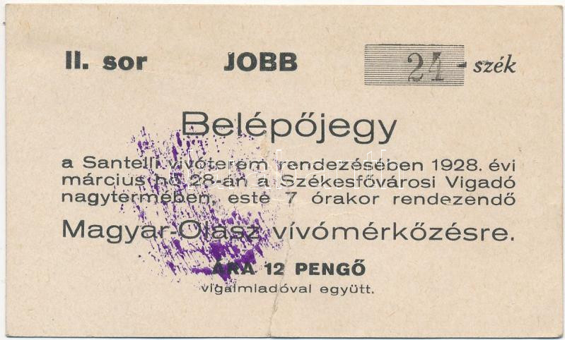 1928 Bp., Belépőjegy a magyar-olasz vívómérkőzésre https://www.darabanth.com/de/273-Fernauktion/273.0/Andere-Sammelgebiete/Dokument~31/1928-Bp-Belepojegy-a-magyar-olasz-vivomerkozesre~II1391597
