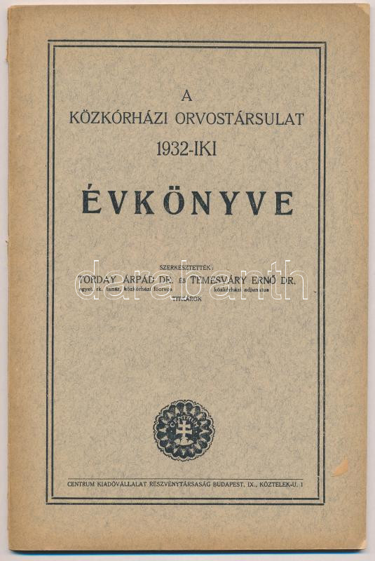 1932 dr. Torday Árpád - dr. Temesvári Ernő (szerk.): A Közkorházi Orvostársulat Évkönyve. Budapest, 1932, Centrum Kiadóvállalat Rt, 63 p. Kiadói papírkötés.