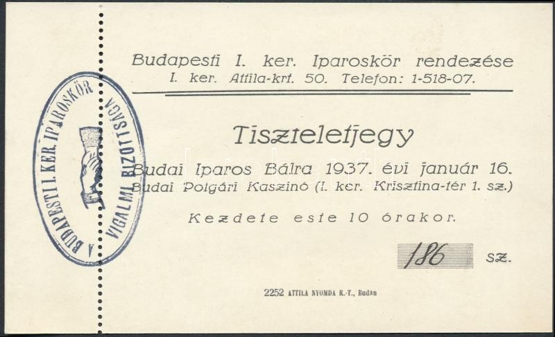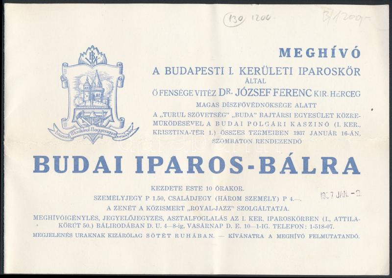 Beschreibung: 1937 Meghívó a Budapesti I. kerületi iparoskör által rendezett budai iparos bálra, hozzá tiszteletjegy