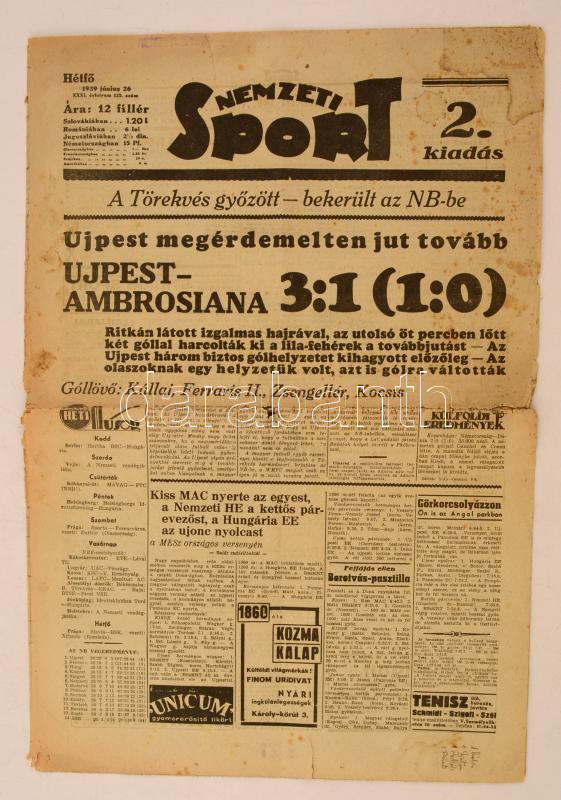 Beschreibung: 1939 a Nemzeti Sport 31. évf. 126. lapszáma, érdekes aktuális hírekkel