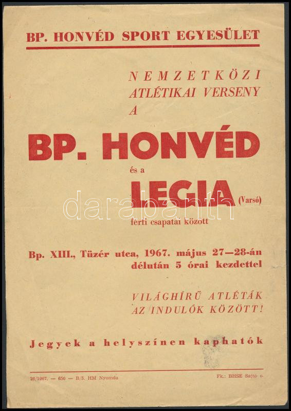 1967 Bp.XIII., A BP. Honvéd Sport Egyesület atlétikai versenyt hirdető... https://www.darabanth.com/de/273-Fernauktion/273.0/Andere-Sammelgebiete/Drucksachen~8/1967-BpXIII-A-BP-Honved-Sport-Egyesulet-atletikai-versenyt-hirdeto-kisplakatja-25x18-cm~II1391734