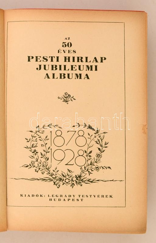 Az 50 éves Pesti Hirlap jubileumi albuma 1878-1928. Budapest, 1928, Légrády-Testvérek, 1072 p. Szövegközti és egész oldalas képekkel igen gazdagon illusztrálva. Kiadói színes, fűzött, egészvászon kötés. borítóban. Némileg foltos, kopott, de alapvetően jó állapotban.