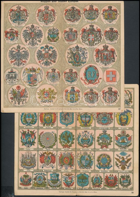 Beschreibung: cca 1910-1914 Európa államainak és a jelentős Európán kívüli államok címerei, kiadja Kartogr. Anstalt von Freytag&Berndt, Bécs, 2 db, szakadással, 18x17 cm