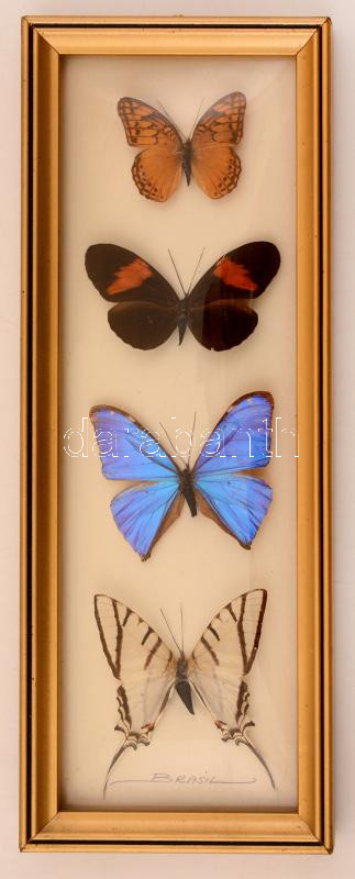 3db-os lepkegyűjtemény, üvegezett fa keretben, Brasil felirattal, 32x13x2cm. /